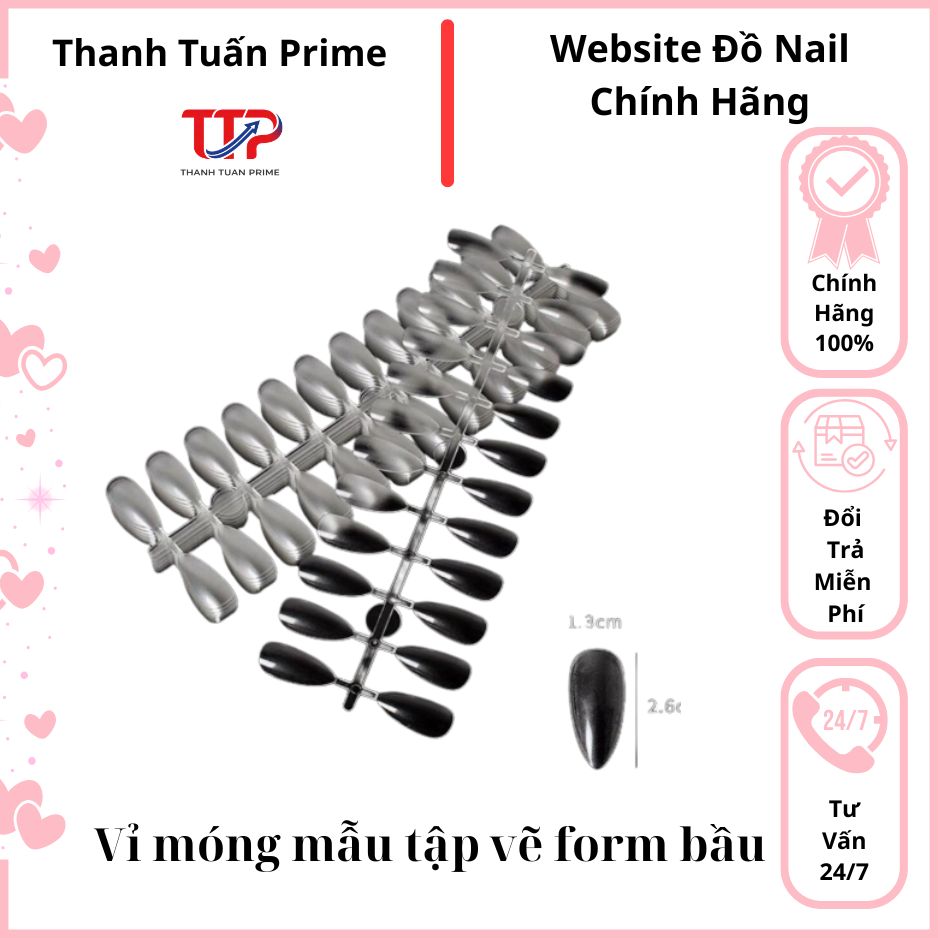✨ Vỉ Móng Mẫu Tập Vẽ Form Bầu là sản phẩm không thể thiếu trong bộ dụng cụ của thợ nail, salon chuyên nghiệp và người mới học nghề. Đây là loại móng mẫu chuyên dùng để tập vẽ nail, test màu sơn gel, trưng bày mẫu thiết kế và lên ý tưởng bộ móng trước khi làm trên tay thật.