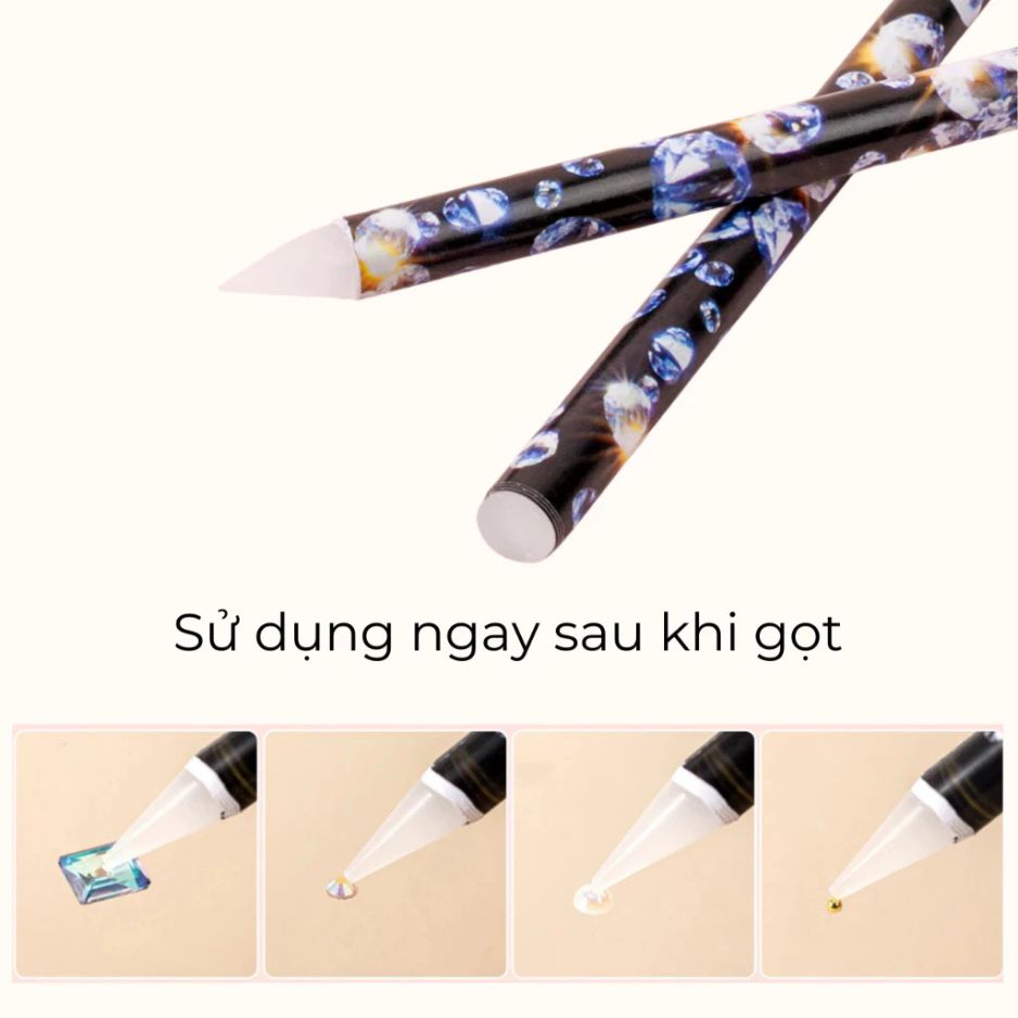 Phần đầu bút là lõi sáp chuyên dụng có độ bám tốt, giúp nhặt đá dễ dàng mà không làm trầy xước bề mặt phụ kiện. Chỉ cần sử dụng ngay sau khi gọt đầu sáp, bút có thể hỗ trợ thao tác với nhiều loại đá và phụ kiện khác nhau như đá vuông, đá tròn, hạt bi, charm mini…