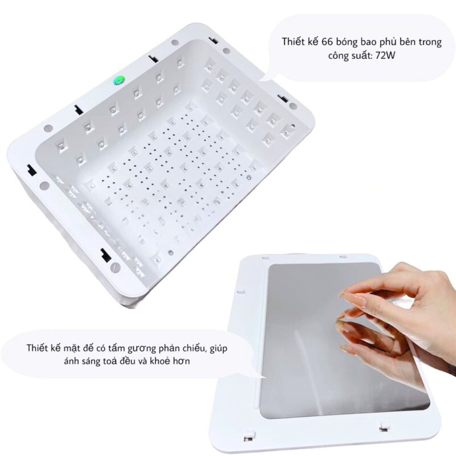 Sản phẩm trang bị 66 bóng LED công suất 72W, hỗ trợ hơ gel nhanh, ánh sáng phủ đều toàn bộ khoang, hạn chế góc chết và giúp gel khô ổn định hơn. Đây là lựa chọn phù hợp cho tiệm nail chuyên nghiệp, thợ nail làm dịch vụ và cả người làm nail tại nhà muốn trải nghiệm cao cấp hơn.
