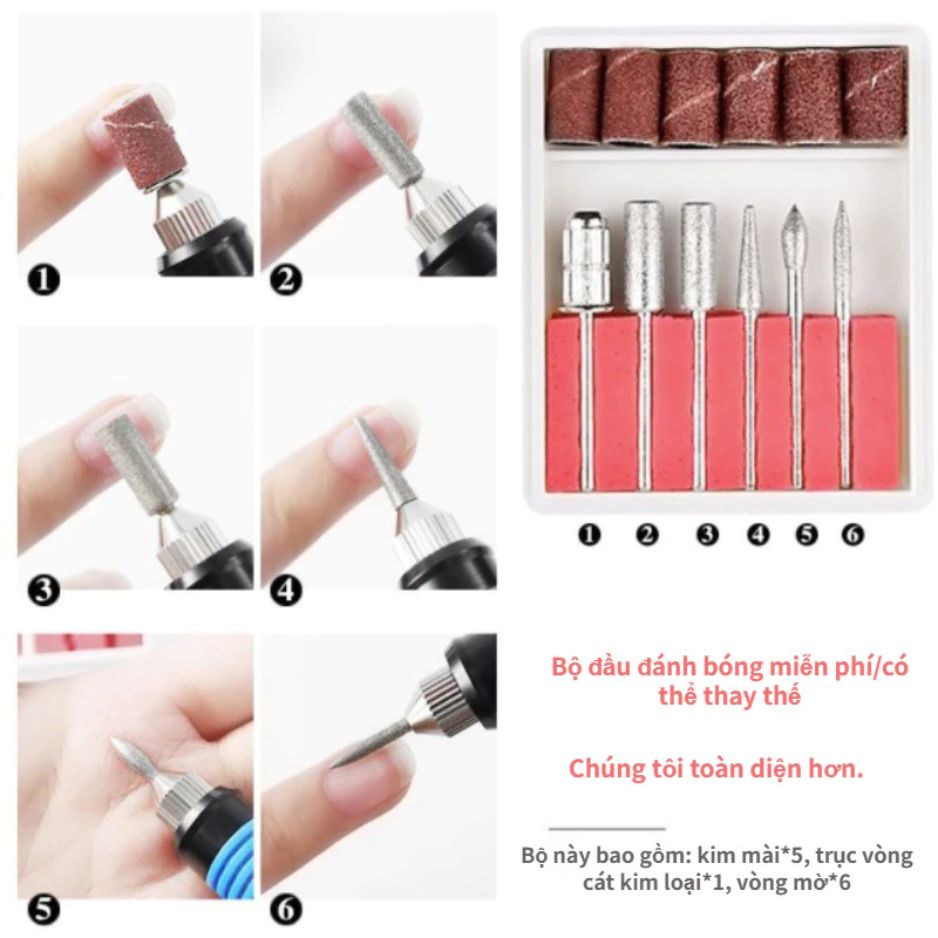 Theo hình ảnh sản phẩm, máy đi kèm bộ đầu mài cơ bản hỗ trợ nhiều thao tác làm nail khác nhau.